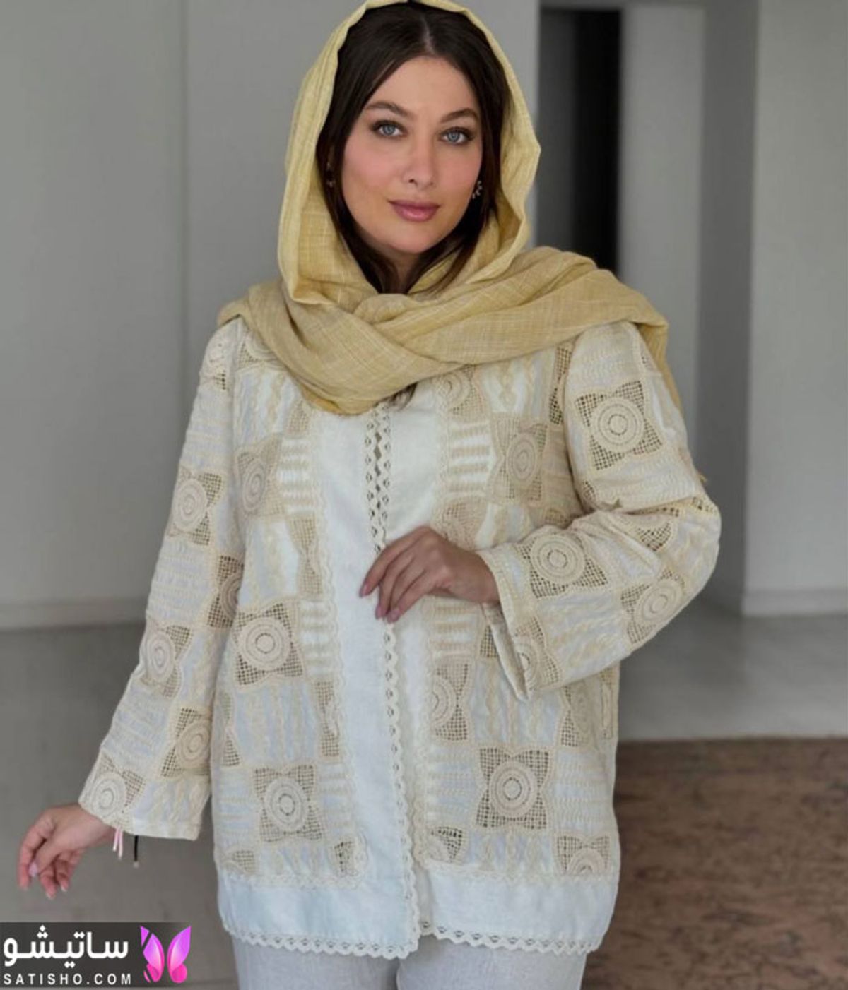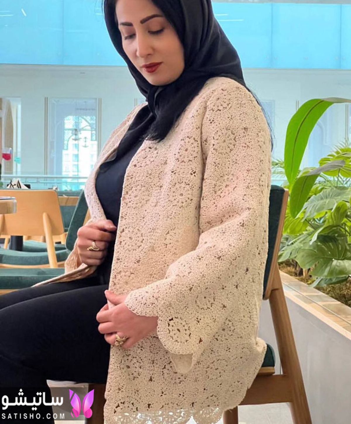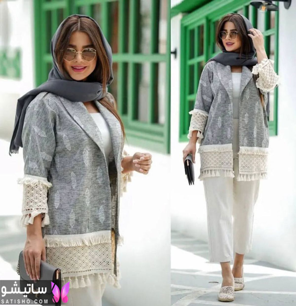 استایل کردن مدل مانتو با پارچه قلاب بافی