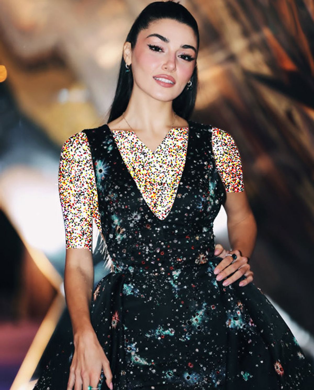 هانده ارچل بازیگر مشهور ترک با پیراهن کهکشانی کالکشن برند زهیر مراد در ریاض+تصاویر