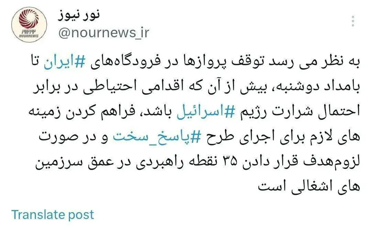 نور نیوز در توئیتی نوشت: به نظر میرسد توقف پروازها در فرودگاههای ایران تا بامداد دوشنبه بیش از آن که اقدامی احتیاطی در برابر احتمال شرارت رژیم اسرائیل، باشد فراهم کردن زمینه های لازم برای اجرای طرح پاسخ سخت و در صورت لزوم هدف قرار دادن ۳۵ نقطه راهبردی در عمق سرزمین های اشغالی است.