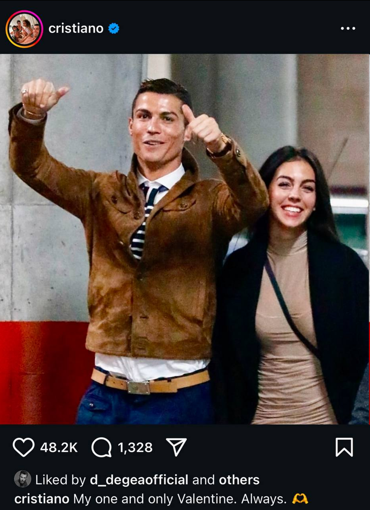 رونالدو در پست اینستاگرامیاش روز ولنتاین را به جورجینا تبریک گفت و در جملهای احساسی نوشت که ولنتاین او در زندگیاش همیشه جورجینا است.