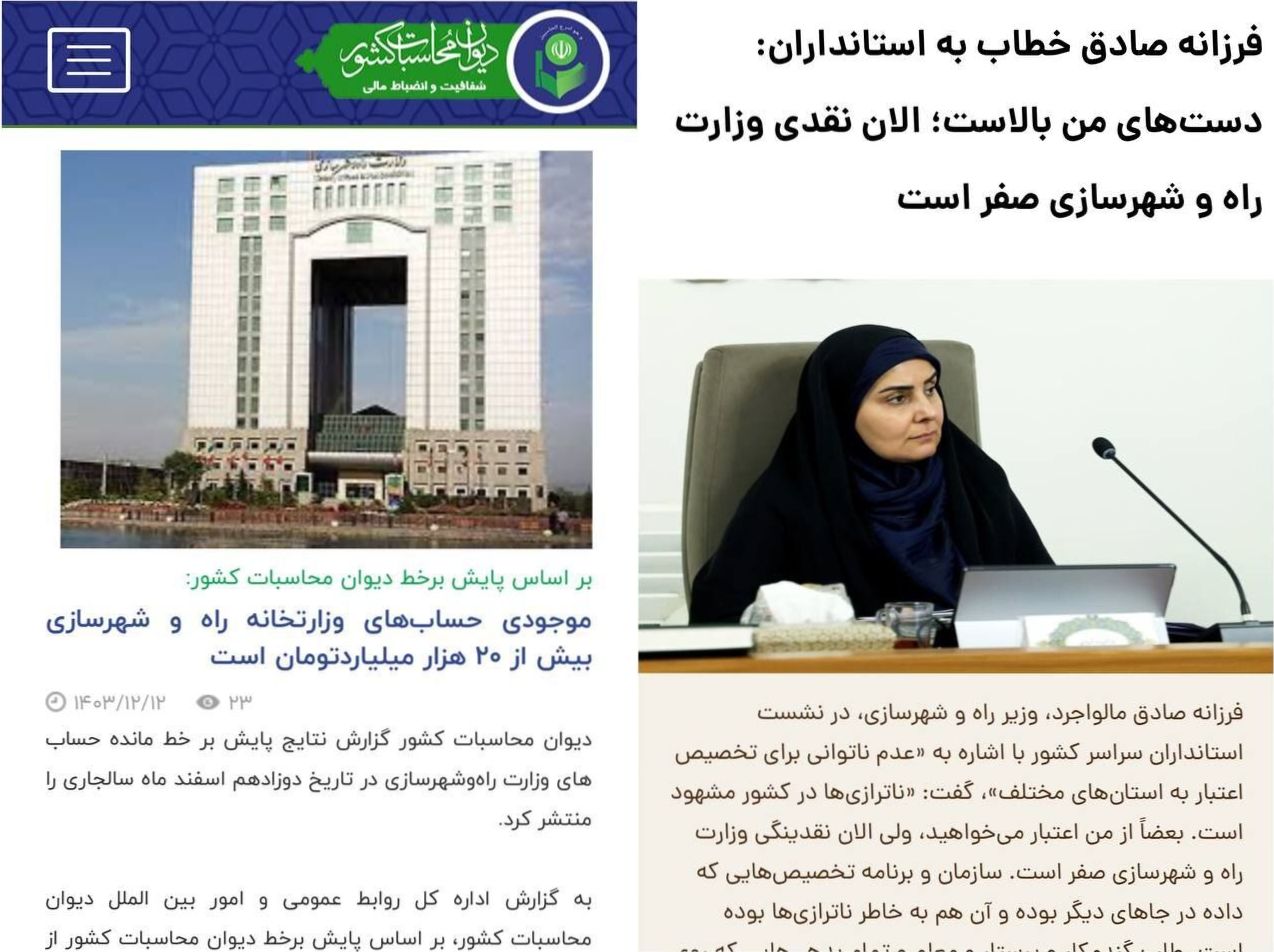 پساز آنکه روز گذشته، فرزانه صادق (وزیر راه) مدعی شد موجودی نقدی وزارت راه و شهرسازی صفر است، امروز دیوان محاسبات کشور پایس برخط حسابهای این وزارتخانه را منتشر کرد. در گزارش نهاد نظارتی مجلس آمده است: در تاریخ دوازدهم اسفندماه ۱۴۰۳، موجودی حساب پرداخت اعتبارات وزارت راهوشهرسازی بالغ بر ۱۳۰۰ میلیاردتومان بوده است.