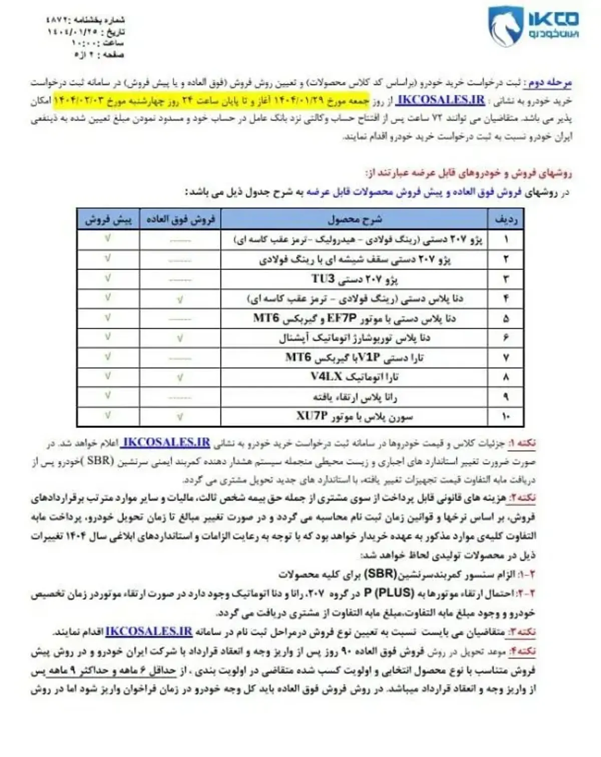 جزئیات شرایط پیش فروش و فروش فوقالعاده محصولات ایران خودرو اعلام شد. فروش ۱۰ محصول ایران خودرو از جمعه ۲۹ فروردین ۱۴۰۴ آغاز میشود.