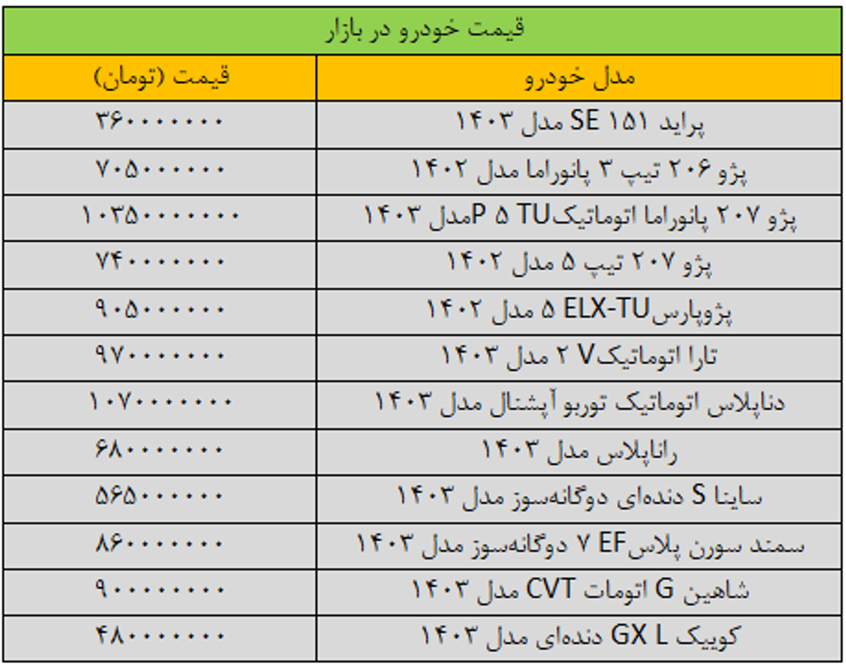 در جدول زیر، قیمت انواع خودرو در بازار آزاد تهران، قابل مشاهده است: