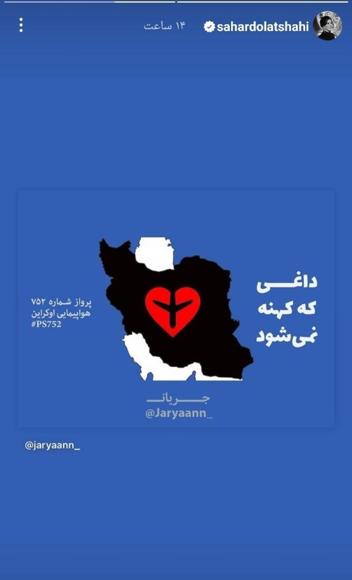 سحر دولتشاهی (بازیگر ۴۵ ساله) با انتشار یک استوری یاد و خاطره درگذشتگان هواپیمای اوکراینی در سال ۹۸ را گرامی داشت.