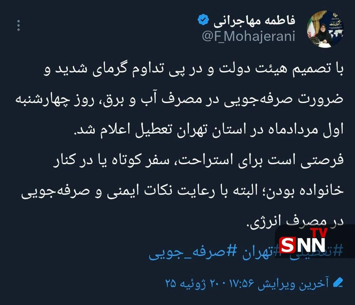 سخنگوی دولت اعلام کرد: با تصمیم هیئت دولت و در پی تداوم گرمای شدید و ضرورت صرفهجویی در مصرف آب و برق، روز چهارشنبه اول مردادماه در استان تهران تعطیل اعلام شد.