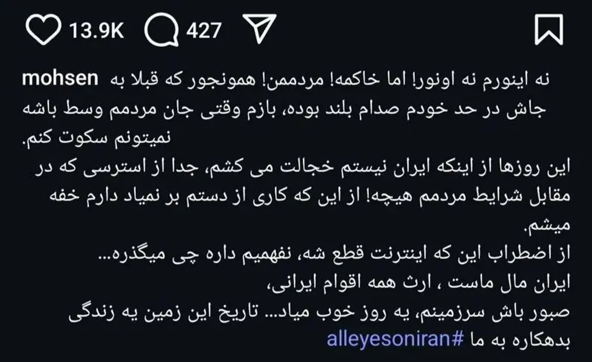 محسن یگانه در واکنش به جنایات رژیم صهیونیستی علیه ایران نوشت: نه اینورم نه اونور اما خاکمه مردممن. همونجور که قبلا به جاش در حد خودم صدام بلند بوده بازم وقتی جان مردمم وسط باشه نمیتونم سکوت کنم. این روزها از اینکه ایران نیستم خجالت میکشم جدا از استرسی که در مقابل شرایط مردمم هیچه از این که کاری از دستم بر نمیاد دارم خفه میشم.