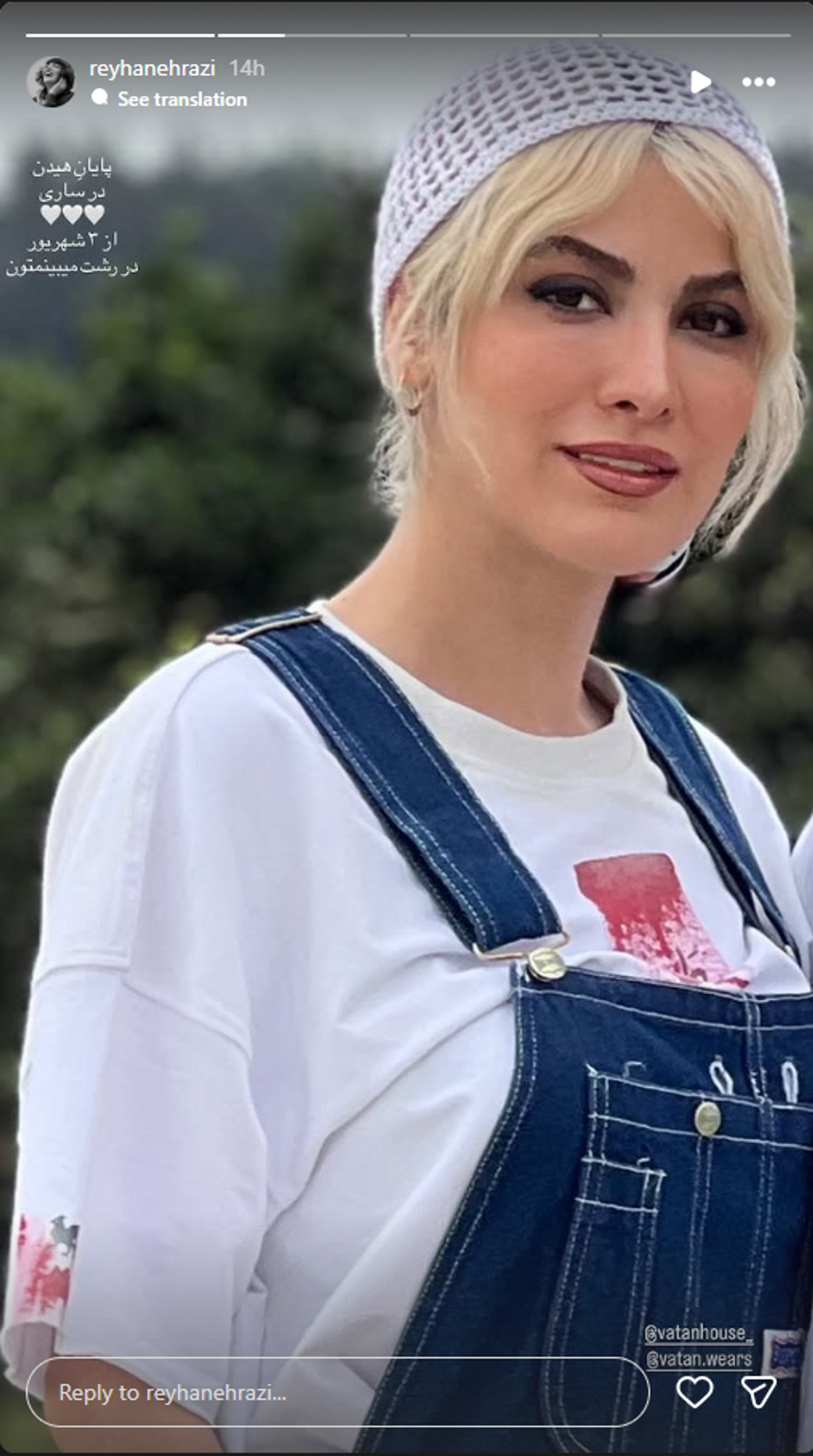 ریحانه رضی بازیگر نقش حوری در سریال تاسیان با انتشار پست و استوری از خودش برا مخاطبان خود به اشتراک گذاشت همچنین او نوشت :