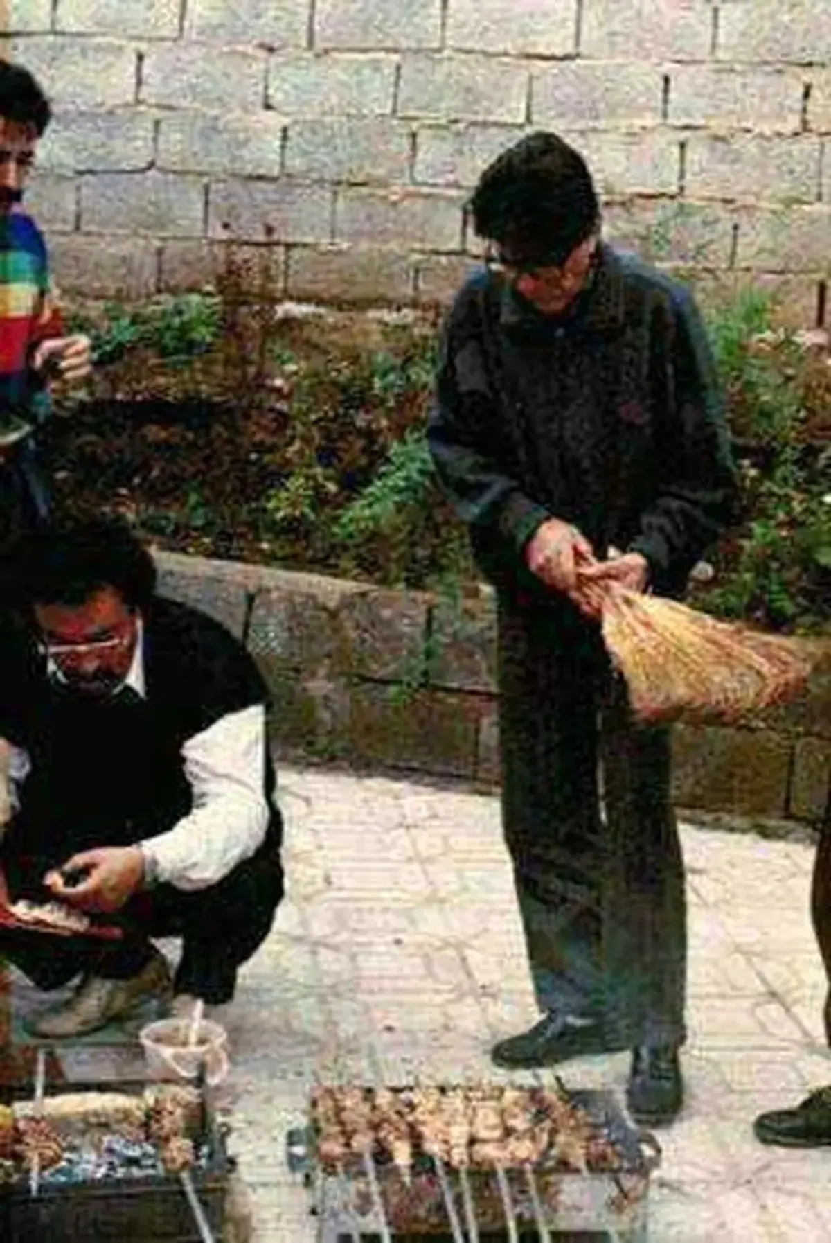 عکس قدیمی از استاد محمدرضا شجریان در حال باد زدن کباب با جارو