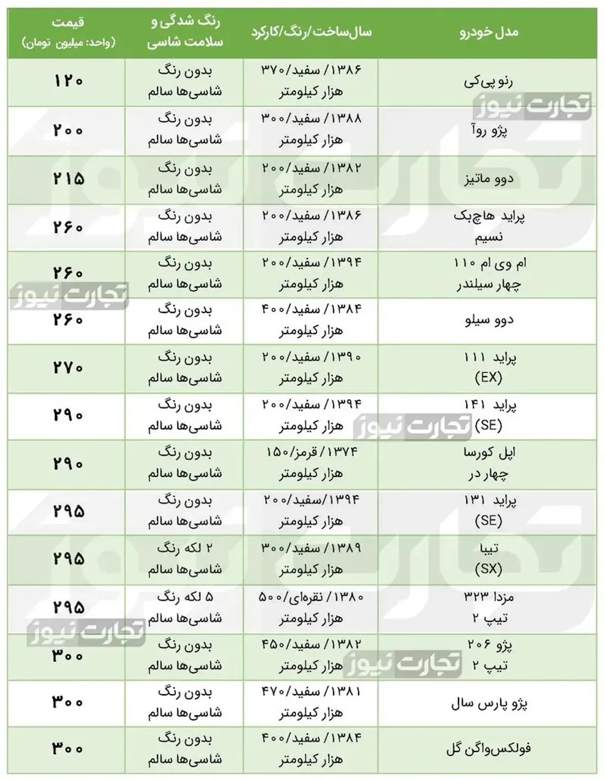بر اساس بررسی میدانی بازار خودرو، در حال حاضر حدود ۱۵ مدل پرتقاضا با بودجه حدود ۳۰۰ میلیون تومان و کمترین میزان رنگشدگی در بازار معامله میشوند. پیش از انتخاب هریک از این مدلها، بررسی بازار و قیمت قطعات یدکی خودروهای مذکور نیز ضروری تلقی میشود.