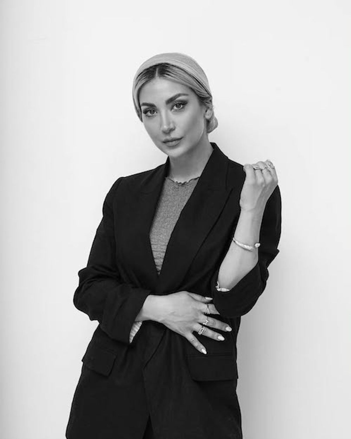 در این تصاویر، مینا با کت بلیزر مشکی و سربندی که روی موهایش قرار گرفته ظاهر شده است. این ترکیب کلاسیک و ساده، حالتی شیک و مرتب به او بخشیده و با وجود افکت سیاه و سفید، همچنان جلوهای مدرن و جذاب در تصاویر ایجاد کرده است.