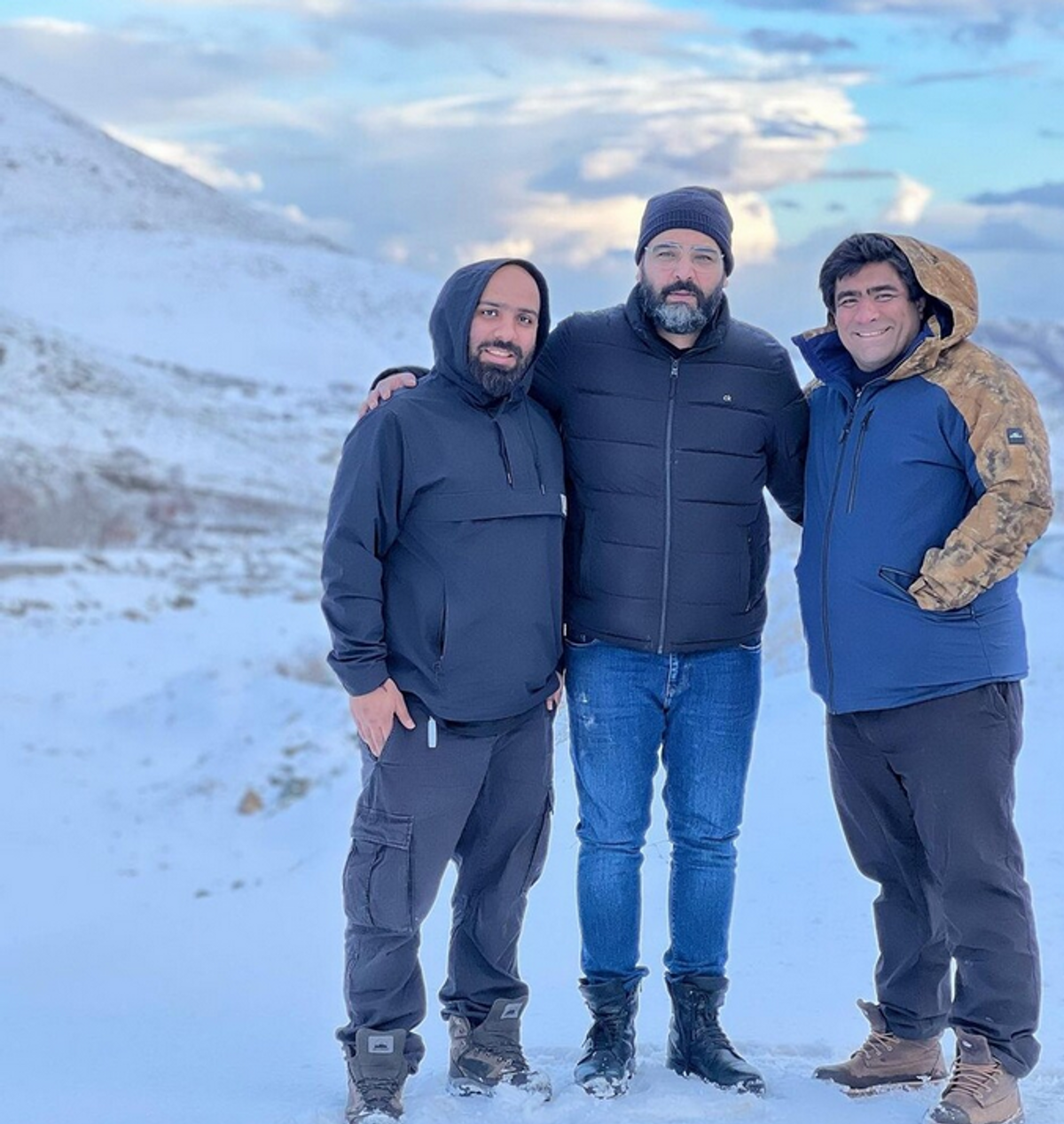 احسان علیخانی با دوستانش به ارتفاعات برفی اطراف تهران رفته است تا ورزش کند.