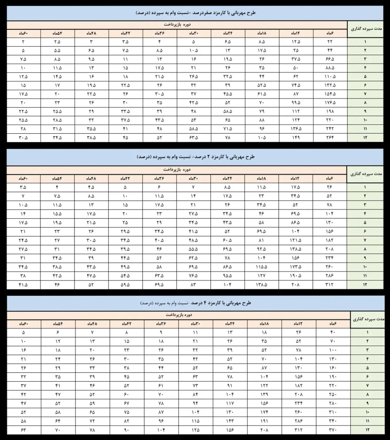جداول زیر، نسبت وام به سپرده در طرح مهربانی بانک ملی را به تفکیک، نرخ سود، دوره بازپرداخت و مدت سپردهگذاری نشان میدهند.