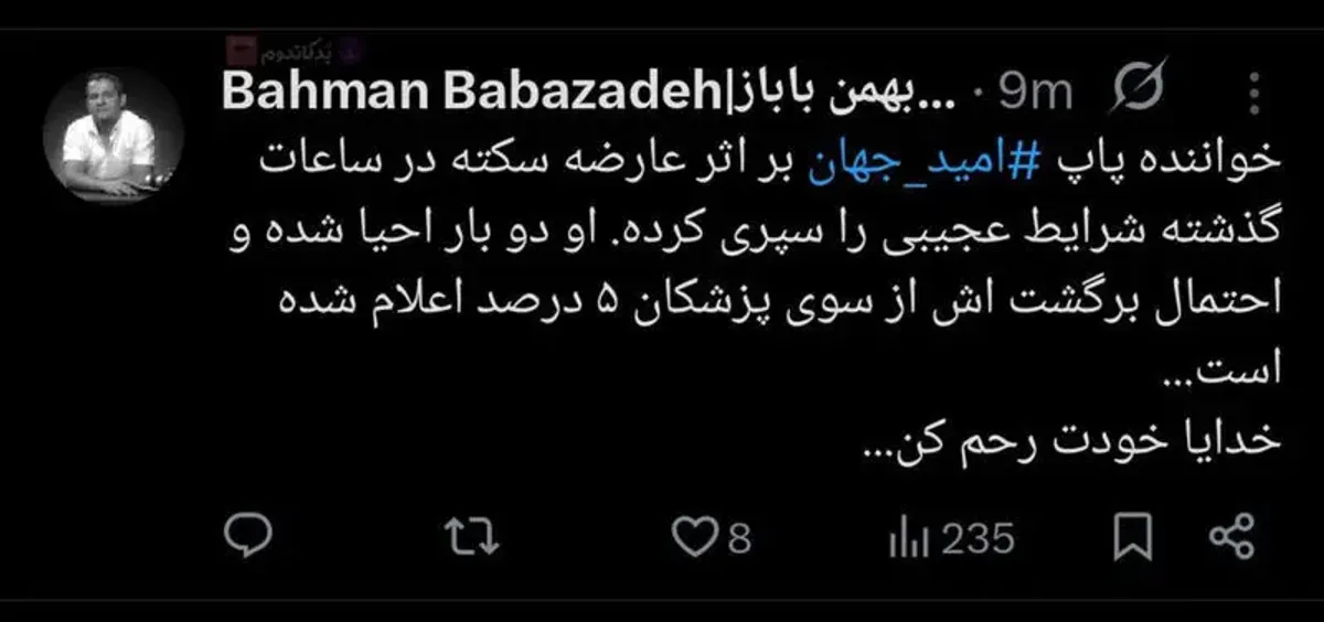بهمن بابازاده، خبرنگار موسیقی، با انتشار متنی در حساب کاربری خود در فضای مجازی ضمن اشاره به وضعیت وخیم این خواننده مطرح، نوشت: خواننده محبوب پاپ، امید جهان، طی ساعتهای گذشته دچار عارضه سکته شده و وضعیت جسمانی بسیار سختی را سپری میکند. بنا به گفته پزشکان، وی تاکنون دو بار احیا شده و شانس بازگشت او تنها ۵ درصد است. این خبرنگار در ادامه افزود: «خدایا خودت رحم کن…»