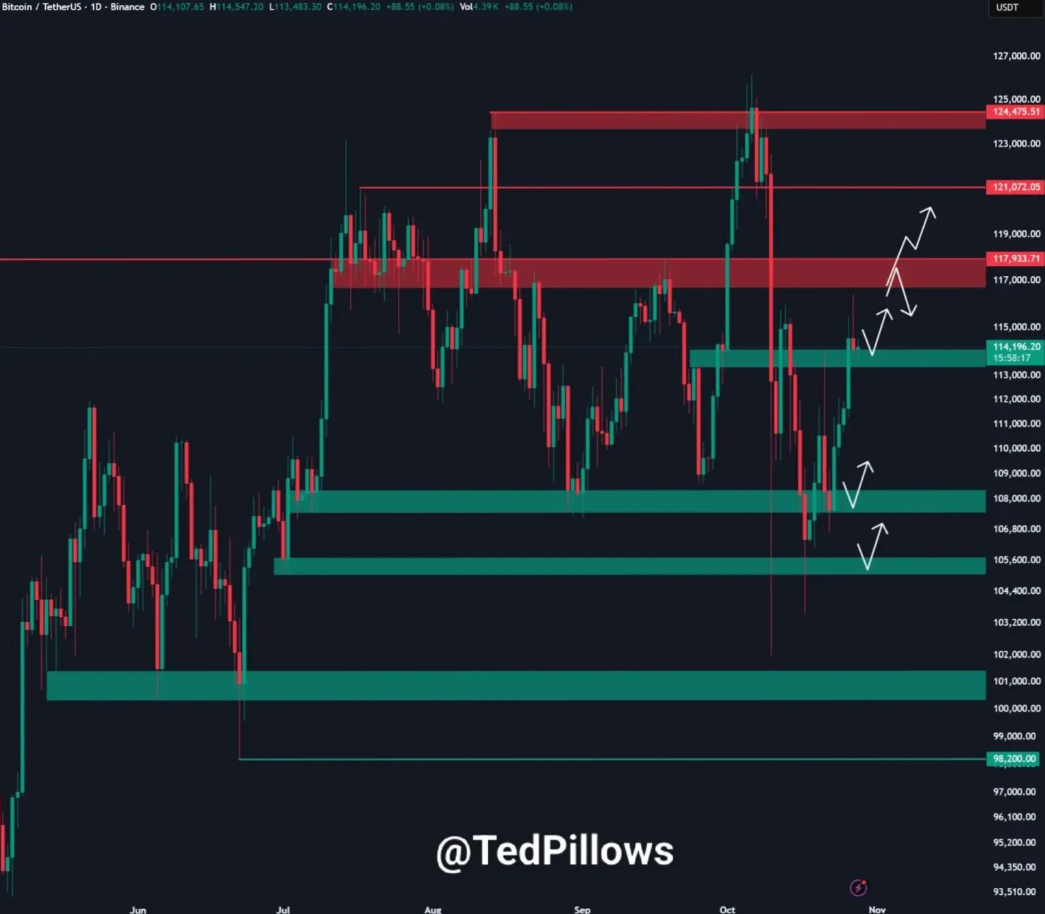 طبق تحلیل رکت کپیتال، اگر بیت کوین بتواند بالای خط میانگین متحرک نمایی ۲۱ هفتهای و سطح ۱۱۴،۵۰۰ دلار تثبیت شود، شانس تداوم مسیر صعودی افزایش مییابد. با این حال، در صورت شکست حمایتها احتمال اصلاح تا محدوده ۱۱۰ هزار دلار وجود دارد. شاخص RSI نیز در تایمفریمهای پایین نشانههایی از واگرایی مثبت را نشان میدهد که میتواند پشتوانه ادامه رشد کوتاهمدت باشد.