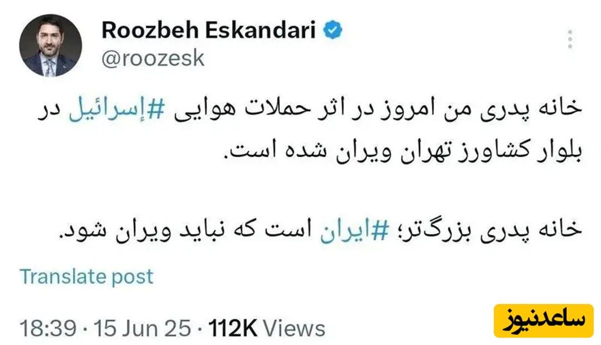 روزبه اسکندری، برادر، با انتشار متنی در حساب کاربری خود در شبکه اجتماعی ایکس به تخریب منزل پدری خود در اثر حمله دیروز اسرائیل به حوالی بلوار کشاورز واکنش نشان داد.