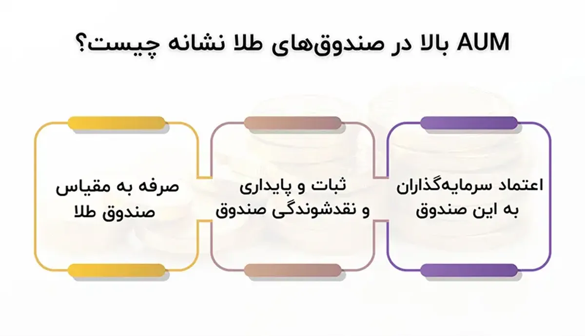 حجم داراییهای تحت مدیریت (Assets Under Management – AUM) یک صندوق، معیاری مهم برای سنجش میزان اعتماد و اقبال عمومی سرمایهگذاران به آن است. این معیار نیز در انتخاب بهترین صندوق طلا میبایست درنظر گرفته شود. یک AUM بزرگ و رو به رشد، چندین پیام مثبت دارد:
