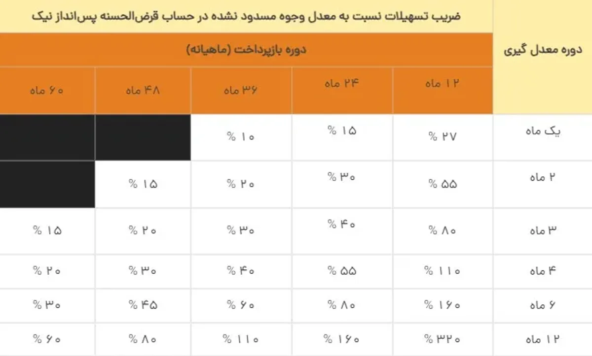 جزئیات دریافت تسهیلات نیک وام بر اساس مدت زمان میانگین حساب و مدت بازپرداخت تسهیلات در جدول زیر قابل مشاهده است.