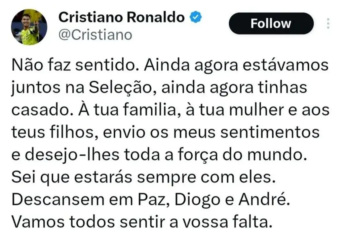 رونالدو در پیامی در شبکههای اجتماعی نوشت: «باورکردنی نیست. ما همین چند وقت پیش در تیم ملی کنار هم بودیم و تو تازه ازدواج کرده بودی. به خانوادهات، همسرت و فرزندانت تسلیت میگویم و برای آنها آرزوی صبر و قدرت فراوان دارم. میدانم همیشه کنارشان خواهی بود. در آرامش بخوابید، دیوگو و آندره. همه ما دلتنگ شما خواهیم شد.»