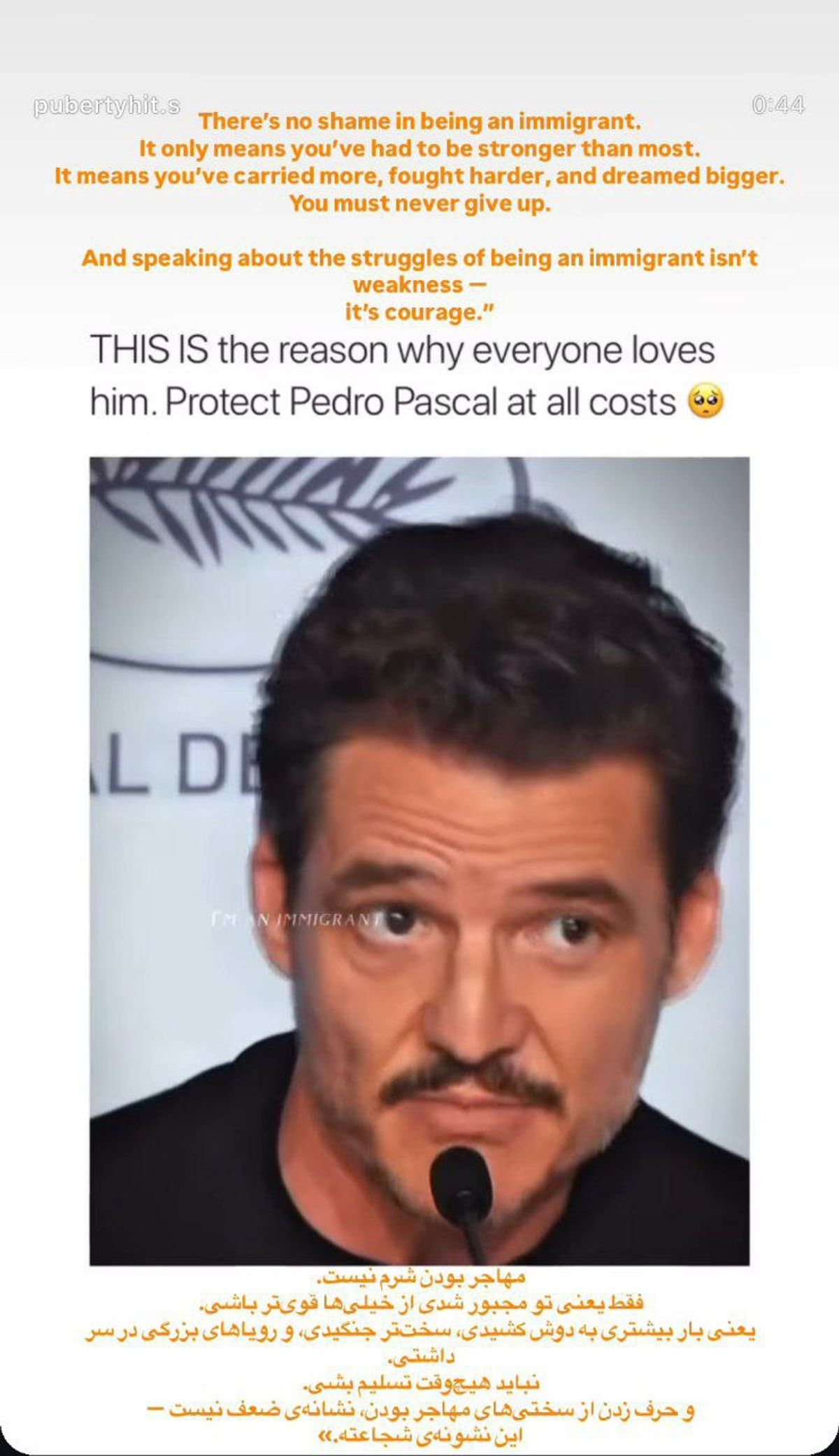 در این پیام، که برگرفته از صحبتهای پدرو پاسکال است، آمده: «مهاجر بودن شرم نیست؛ فقط یعنی تو مجبور شدی از خیلیها قویتر باشی... نباید هیچوقت تسلیم بشی... و حرف زدن از سختیهای مهاجر بودن نشانهی ضعف نیست – این نشونهی شجاعته.»