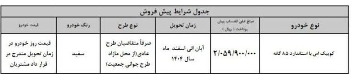 گروه خودروسازی سایپا در جدیدترین اطلاعیه خود شرایط پیشفروش خودرو کوییک S با استانداردهای بهروز ۸۵گانه را اعلام کرد. این طرح ویژه متقاضیان عادی است که از محل مازاد ظرفیت طرح حمایت از خانواده و جوانی جمعیت اجرا میشود. جزئیات کامل ثبتنام، شرایط عمومی و زمان تحویل خودرو در ادامه ارائه شده است.
