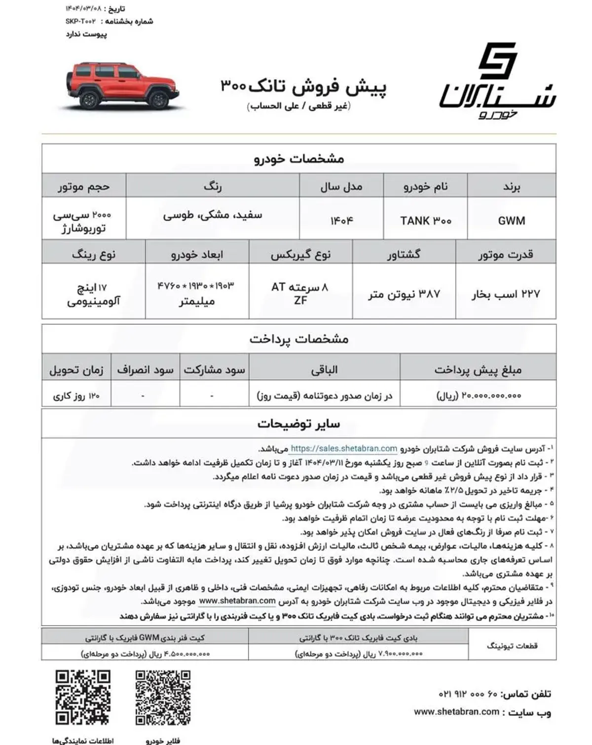 شرکت شتابران خودرو عرضه کننده محصولات تانک شرایط پیش فروش شاسی بلند تانک ۳۰۰ را ویژه خرداد ماه ۱۴۰۴ را اعلام کرد.