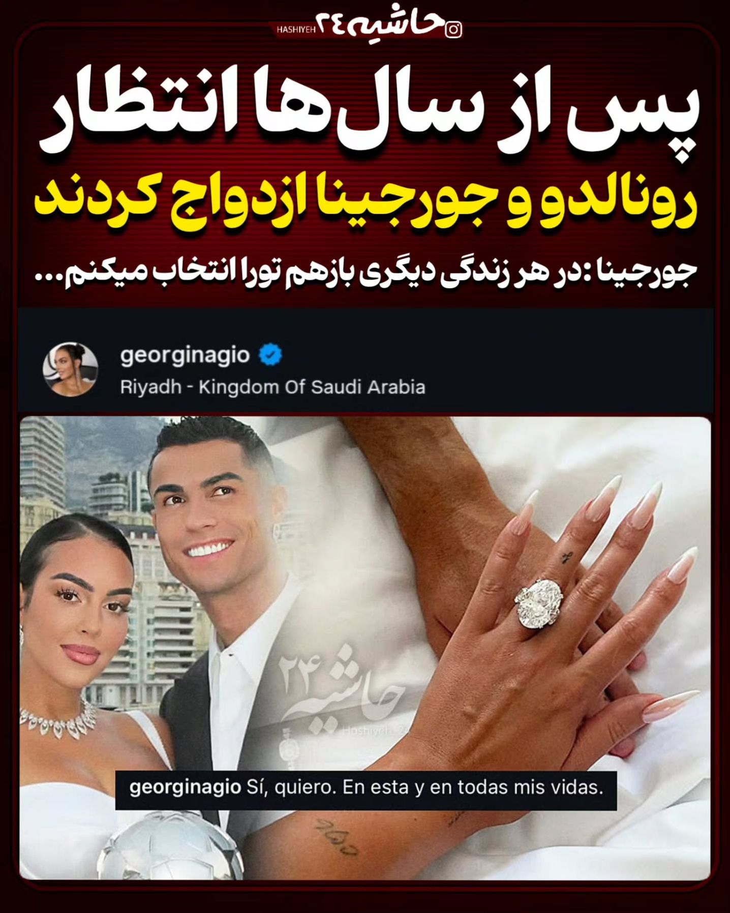 کریستیانو رونالدو با انتشار تصویری از حلقه ازدواجشان خبر ازدواج رسمی خبر داد.