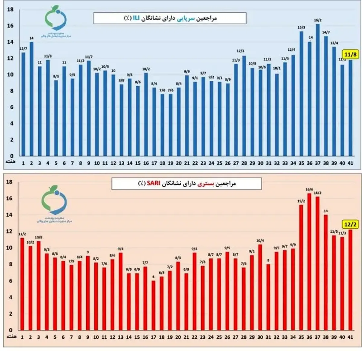 به گزارش صدا و سیما، در هفته دوم دیماه ۱۴۰۴، نسبت موارد دارای علائم عفونتهای تنفسی، هم در مراجعین سرپایی و هم در مراجعین بستری اندکی افزایش یافته؛ به طوری که ۱۱/۸ درصد از مراجعین سرپایی دارای علائم شبه آنفلوانزا (II) و ۱۲/۲ درصد از مراجعین، بستری دارای علائم تنفسی شدید (SARI) بوده اند.