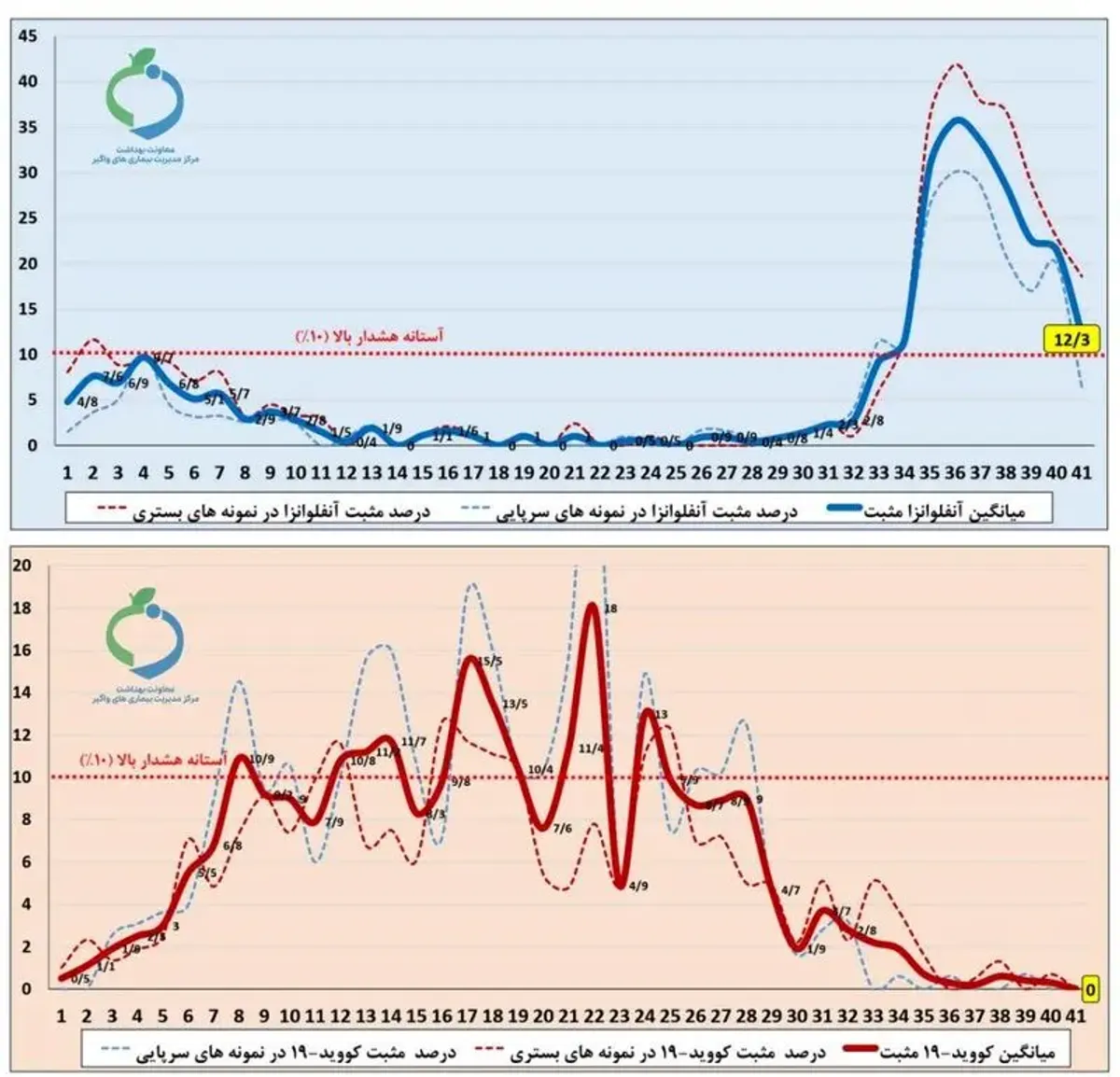 در این هفته، نسبت نمونههای مثبت از نظر آنفلوانزا، هم در بیماران سرپایی و هم در بیماران بستری کاهش نشان داده است؛ لیکن در بیماران بستری هنوز نزدیک به دو برابر آستانه هشدار بالا قرار دارد لازم به ذکر است که تایپ و ساب تایپ غالب به ترتیب «A» و «H۳N۲» بوده است. نسبت نمونههای تنفسی مثبت از نظر کووید-۱۹ همچنان در سطح پایینی قرار دارد.