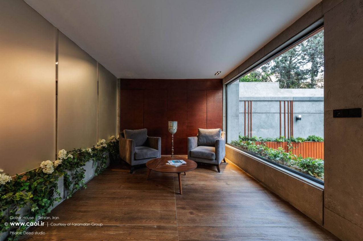 از سوی دیگر به دلیل وجود فضای سبز موجود که شامل درختان کاج و سرو می شد بر آن شدیم که این پوشش گیاهی نمادین را با الهام از عناصر پایه ای معماری ایرانی با فضای نیمه بازایجاد شده ترکیب نماییم این امر با ایجاد حداکثر فضای سبزدر ارتباط با فضای درونی ضمن حفظ سادگی و کیفیت فضایی نوستالژیک حیاط و ایوان های قدیم را زنده می کند. عوامل مهم دیگری که در طراحی مورد نظر قرار گرفت، کیفیت فضاها، توجه به ارتباط فضای داخلی و خارجی و ورودی ها بود. توجه به ساختار فضایی ما را بر آن داشت که ریتم پنل ها در طراحی حیاط و پارکینگ و راه پله ها و فضاهای درونی تداوم یابد و در نهایت تمام تلاش ما بر این بود که خانه گلزار حس خانه بودنش با هر نفسی که در آن فضا می کشیم وجودمان را پر کند.