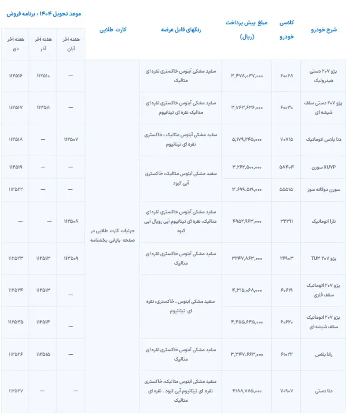 این طرح از تاریخ ۲۹ تیر ۱۴۰۴ آغاز شده است و مشتریان زمان محدودی برای واریز وجه و قطعی کردن ثبتنام خود دارند. این طرح تا پایان روز سهشنبه هفتم مرداد ۱۴۰۴ برقرار باقی خواهد ماند. خودروهای مختلف از خانواده سورن پلاس، دنا پلاس، پژو ۲۰۷، تارا و رانا در این بخشنامه به متقاضیان عرضه شدهاند.