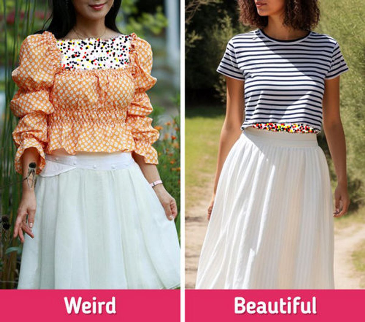 ۶. دامن سفید ساده + تیشرت راهراه