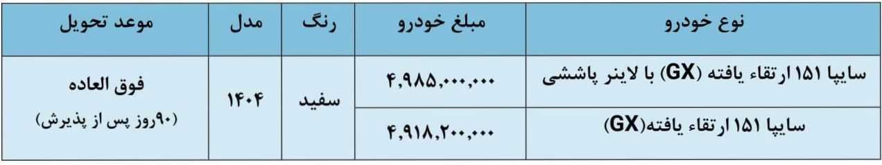 در این مرحله فروش، سایپا ۱۵۱ ارتقایافته مجهز به لاینر پاششی با قیمت ۴۹۸ میلیون و ۵۰۰ هزارتومان عرضه میشود. این خودرو با رنگ سفید و مدل ۱۴۰۴ در اختیار متقاضیان قرار دارد و موعد تحویل آن ۹۰ روز پس از پذیرش تعیین شده است. این نسخه با تجهیز به لاینر پاششی فضای بار، گزینه کاملتر و مقاومتری نسبت به نسخه معمولی محسوب میشود.