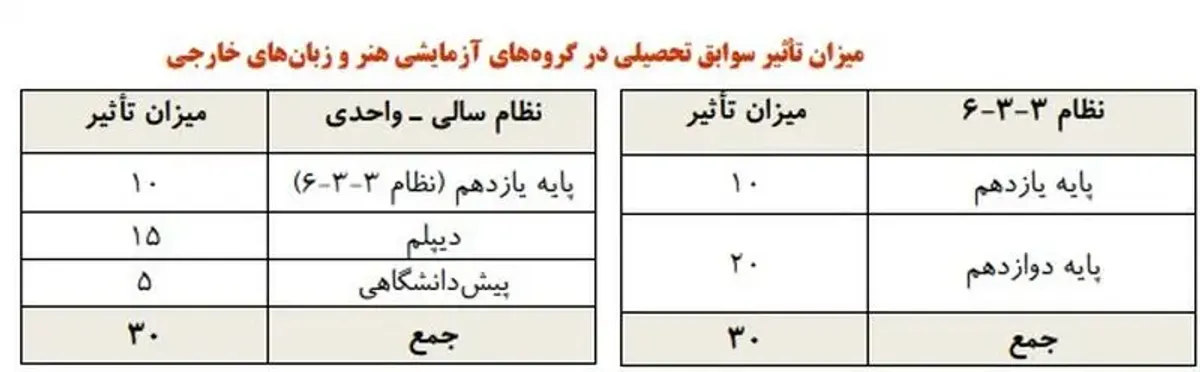 ۴- سهم نمره کل سابقه تحصیلی هر یک از پایهها برای هر دو نظام آموزشی ۶-۳-۳ و سالی واحدی در هر یک از گروههای آزمایشی آزمون سراسری سال ۱۴۰۴ به شرح جداول شماره ۲ و ۳ ذیل است؛