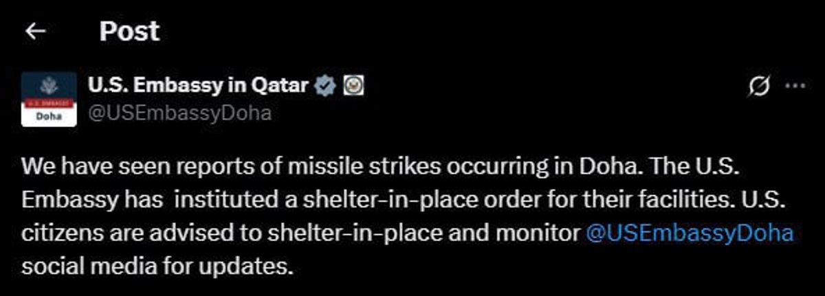 سفارت آمریکا در دوحه گفته از گزارشها درباره حملات موشکی آگاه است و از شهروندان این کشور خواسته در جای امن پناه بگیرند.