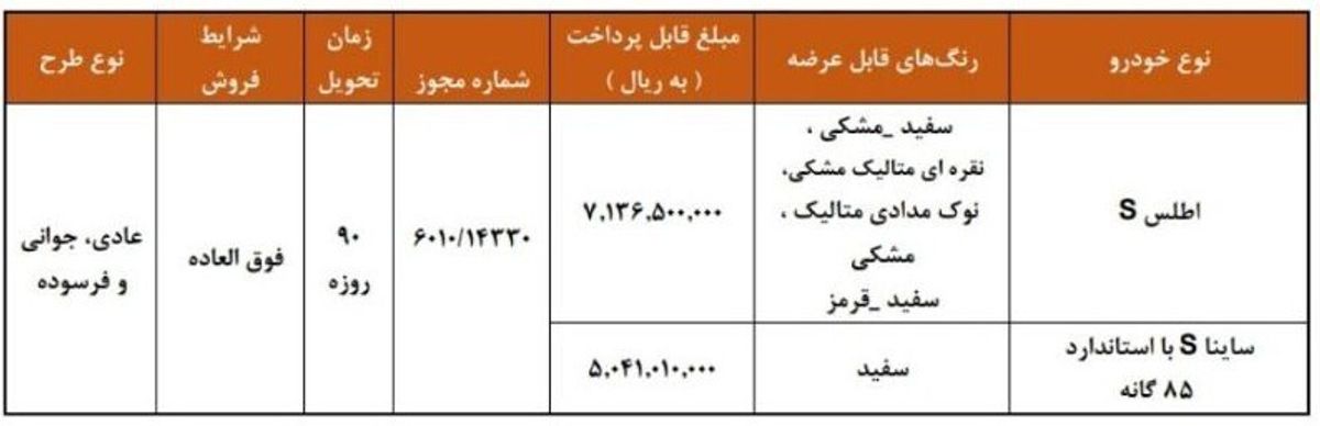 خودروی اطلس S در این دوره فروش فوقالعاده سایپا با قیمت ۷۱۳ میلیون و ۶۹۰ هزار تومان عرضه میشود. این خودرو در رنگهای سفید، مشکی، نقرهای متالیک، مشکی نوک مدادی متالیک، مشکی، سفید و قرمز ارائه خواهد شد. متقاضیان میتوانند از میان طرحهای فروش شامل متقاضیان عادی، جوانی جمعیت، فروش فوقالعاده و جایگزینی خودروهای فرسوده، تنها یک طرح را انتخاب کنند. واریز وجه خودرو برای برندگان قرعهکشی و از طریق اطلاعرسانی شرکت سایپا انجام خواهد شد.