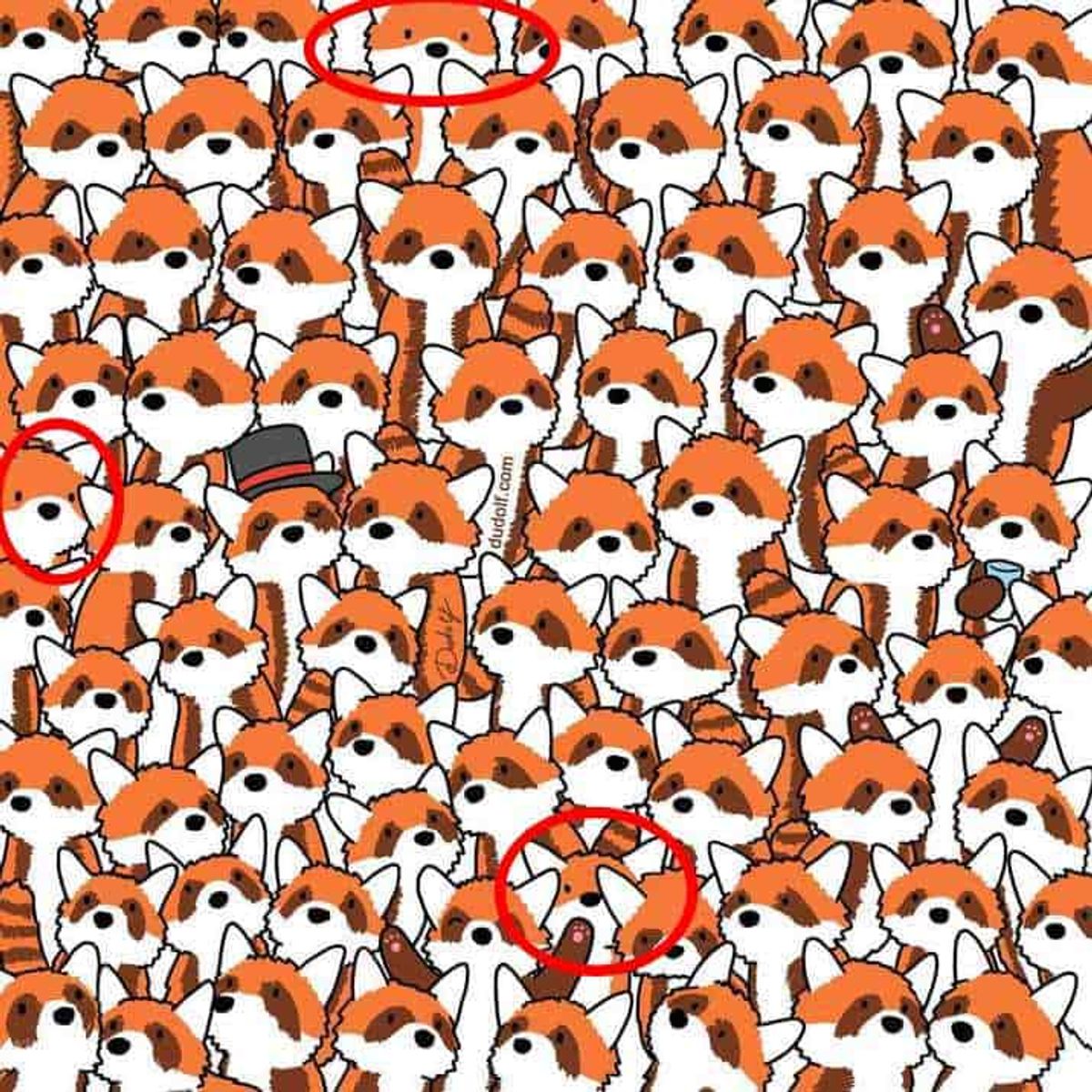 در تصویر زیر که توسط «دودولف» (Gergely Dudás)، هنرمند مشهور مجارستانی طراحی شده، تعدادی پاندا قرمز به تصویر کشیده شدهاند. اما در میان آنها، ۳ روباه قرمز هم پنهان شدهاند. چالش ساده است: