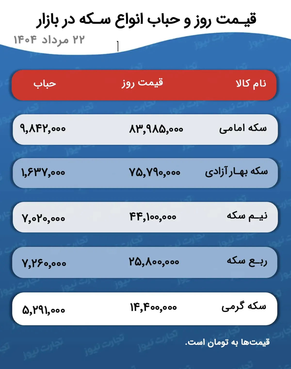 قیمت سکه امامی روز چهارشنبه ۲۲ مرداد میان کانالهای ۸۳ و ۸۴ میلیونی سرگردان بود. در لحظه نگارش این گزارش این قطعه با رشد ۹۷۵ هزار تومانی روی رقم ۸۳ میلیون ۹۸۵ هزار تومانی معامله شد. قیمت سکه بهار آزادی با رشد ۹۱۰ هزار تومانی روی رقم ۷۵ میلیون و ۷۹۰ هزار تومانی معامله شد.