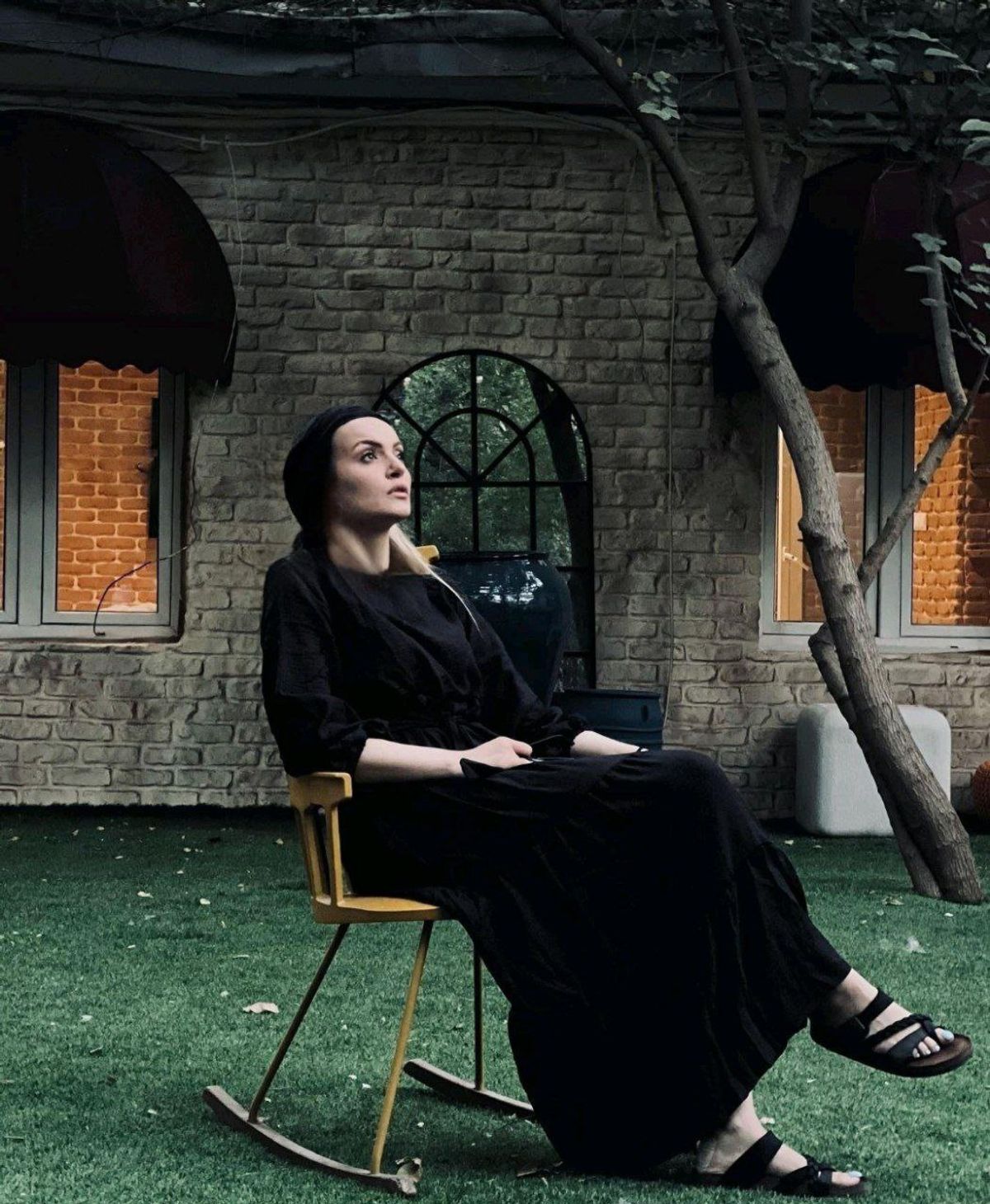نیلوفر پارسا بازیگر آوای باران با استایل مشکی در حیاط خانه اش
