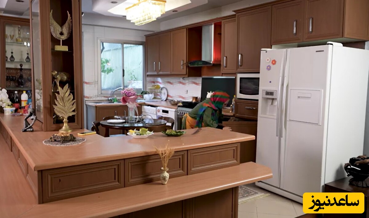 آشپزخانه بهنوش بختیاری در این تصویر طراحیای گرم و سنتی دارد که با کابینتهای چوبی قهوهای تیره به سبک کلاسیک جلوهای اصیل پیدا کرده است. فضای آشپزخانه با جزیرهای چوبی در وسط تکمیل شده که هم کارکرد تزئینی دارد و هم فضای کاربردی برای آمادهسازی غذا یا صرف صبحانه ایجاد میکند.