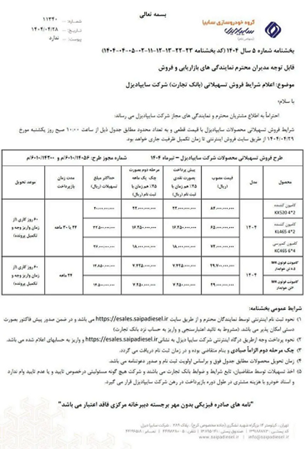 گروه خودروسازی سایپا دیزل طی دو بخشنامه جداگانه به شمارههای ۱۱۲۳۸ و ۱۱۲۴۰ و به تاریخ «۲۸ تیر ۱۴۰۴»، شرایط فروش محصولات خود را در قالب دو طرح «فروش اقساطی با تسهیلات بانکی» و «فروش اعتباری بدون ضامن» اعلام کرد.