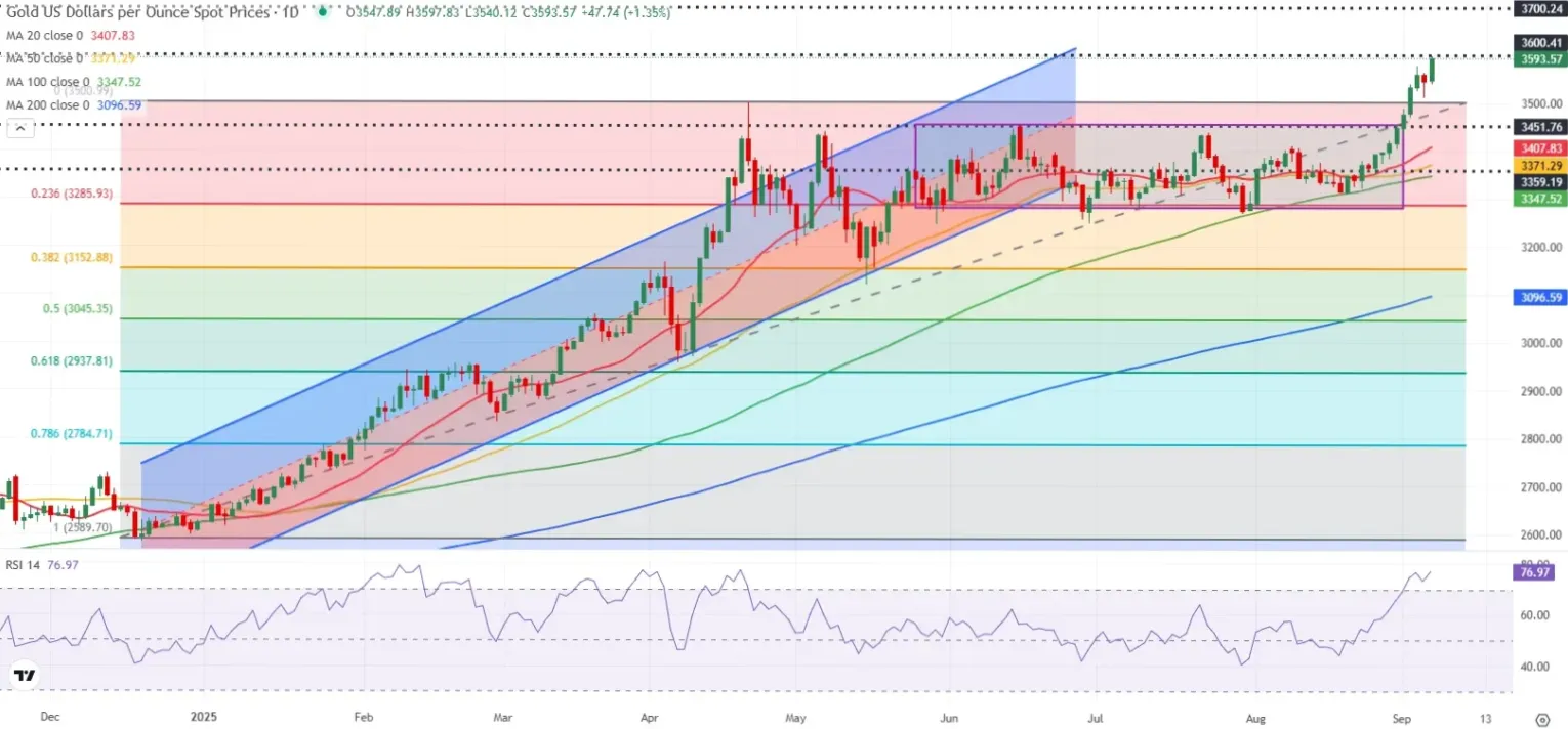 شاخص قدرت نسبی (RSI) در نمودار روزانه بالای سطح ۷۰ قرار گرفته و از وضعیت اشباع خرید حکایت دارد، اما مومنتوم صعودی همچنان فعال است. تثبیت بالای سطح ۳۶۰۰ دلار میتواند مقاومت روانی ۳۷۰۰ دلار را به هدف بعدی تبدیل کند. در صورت اصلاح، حمایتهای کلیدی در سطوح ۳۵۰۰ دلار، سپس ۳۴۵۰ دلار و محدوده ۳۴۰۰–۳۴۰۵ دلار (میانگین متحرک ۲۰ روزه) قرار دارند.