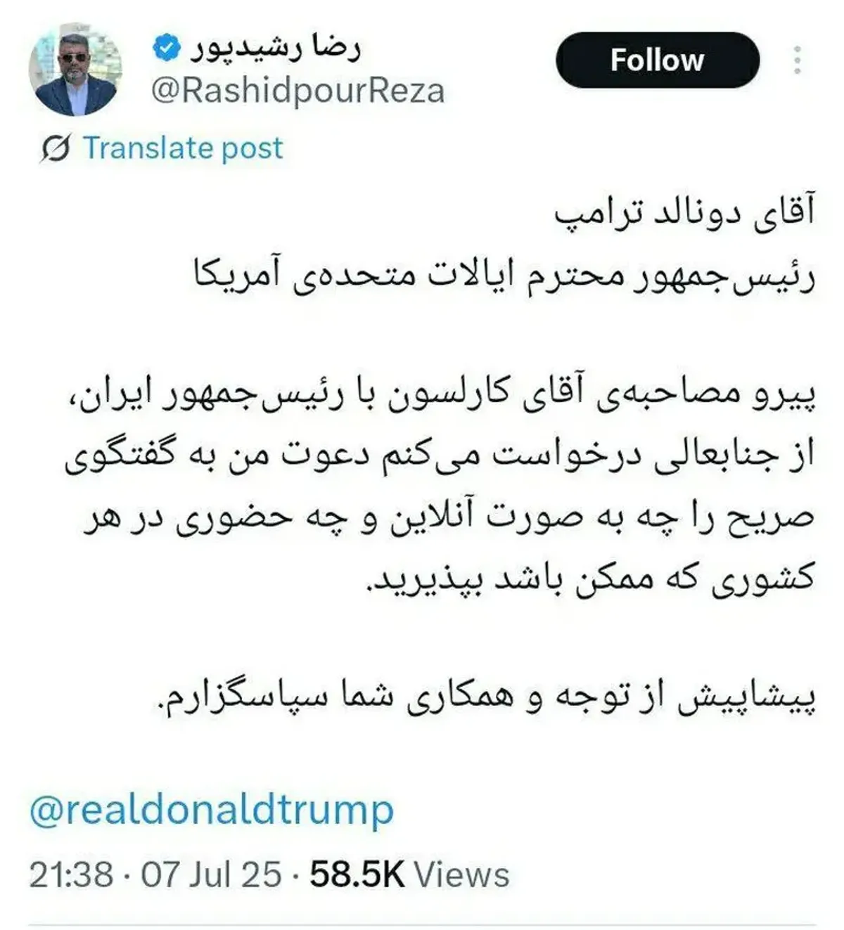 پیرو مصاحبه آقای کارلسون با رئیسجمهور ایران از جنابعالی درخواست میکنم دعوت من به گفتگوی صریح را چه به صورت آنلاین و چه حضوری در هر کشوری که ممکن باشد، بپذیرید.