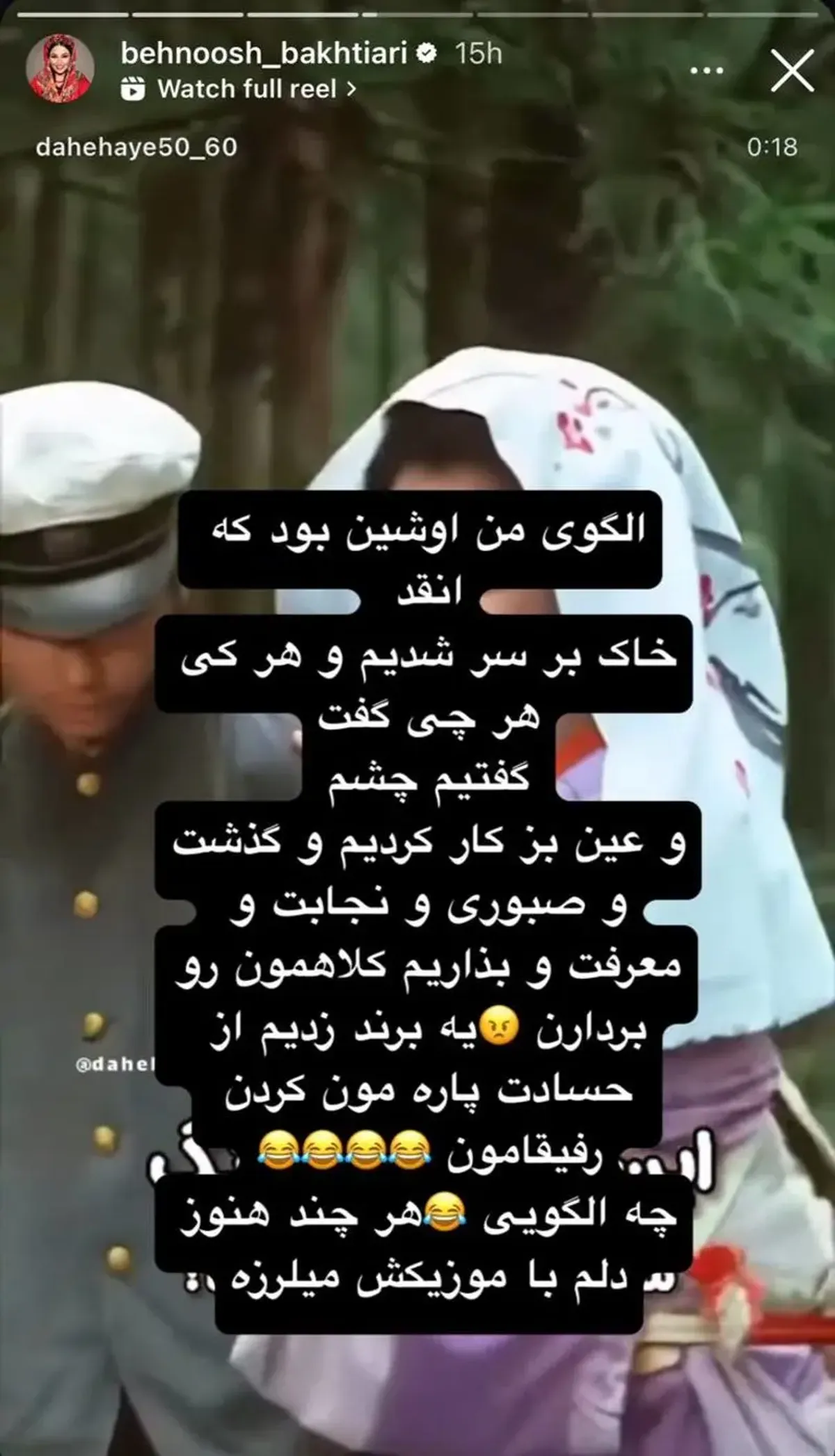 بهنوش بختیاری، بازیگر، با انتشار متنی در صفحه اینستاگرامش از اینکه زمانی الگوی خود را اوشین سریال «سالهای دور از خانه» معرفی کرده، ابراز پشیمانی کرده است.