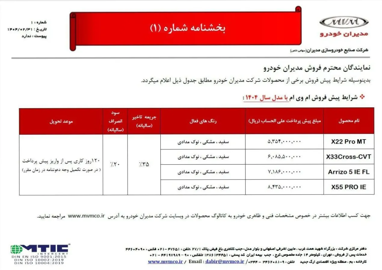 شرکت صنایع خودروسازی مدیران، که با نام مدیران خودرو یا MVM شناخته میشود، یکی از بزرگترین شرکتهای خودروسازی خصوصی در ایران است که در زمینه مونتاژ و عرضه خودروهای شرکت چینی چری (Chery) فعالیت میکند. فروش ۴ محصول مدیران خودرو از امروز 1 خرداد ۱۴۰۴ آغاز شد.