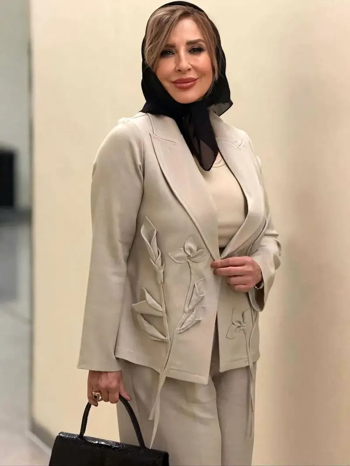 مرجانه گلچین، بازیگر پیشکسوت سینما، در کنسرت احسان نیزن با یک استایل رسمی و خاص حضور یافت. او کت و شلوار بژ رنگی با تکهدوزیهای هنری به شکل گل را با کیف پوستماری مشکی ست کرده بود.