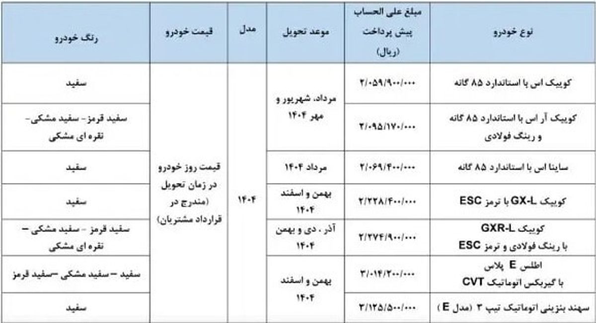 سایپا در این مرحله از پیشفروش محصولات خود، خودروی کوییک S با استاندارد ۸۵ گانه را با قیمت ۲۰۵ میلیون و ۹۹۰ هزارتومان عرضه میکند. زمان تحویل این خودرو مرداد، شهریور و مهر ۱۴۰۴ تعیین شده است.