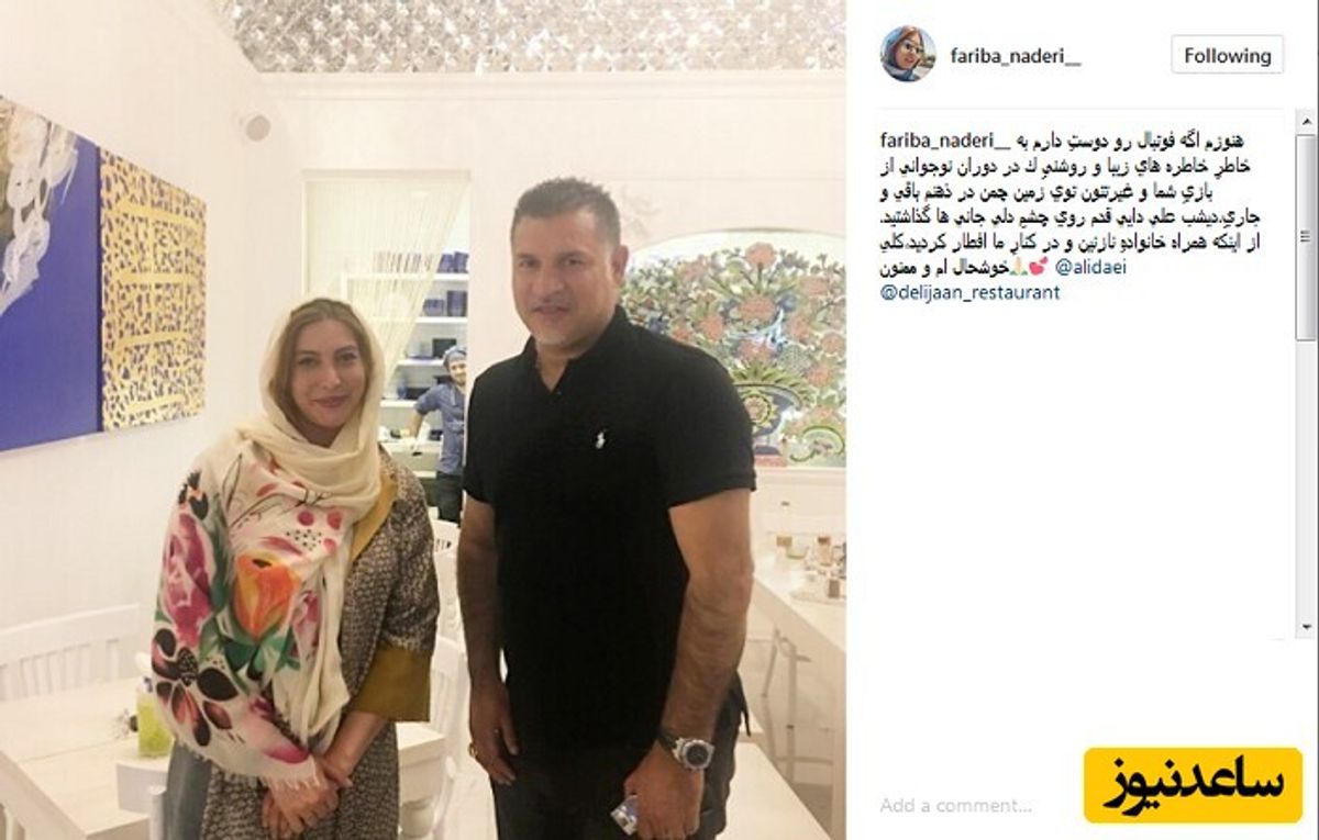 فریبا نادری بازیگر خوب کشورمان چندی پیش تصویری از علی دایی در اینستاگرام منتشر کرد و آمدن او و خانواده اش را به رستورانش خوش آمد گفت که در زیر مشاهده می کنید.