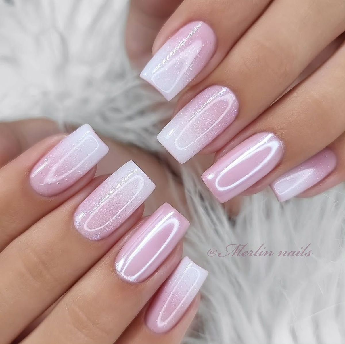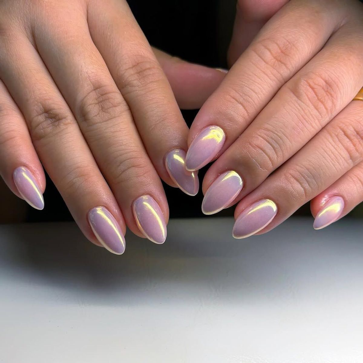 در این طراحی شگفتانگیز، رنگ پایه یاسی بهتدریج در نوک ناخن به صورتی تبدیل میشود. این طیف ملایم با کروم طلایی-صورتی پوشیده شده که به یکدستی و زیبایی رنگها کمک کرده و ظاهری رویایی خلق میکند.