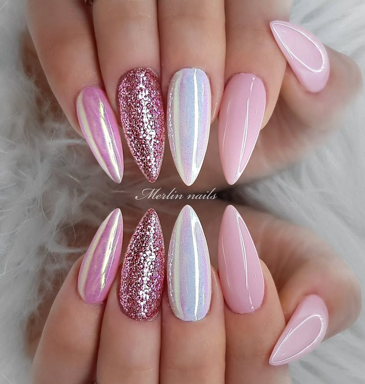 در طراحی دیگری، پایه ناخن سفید شیری همراه با نوک صورتی روشن و کروم، ظاهری لطیف به ناخنهای تیز و خنجری میده.