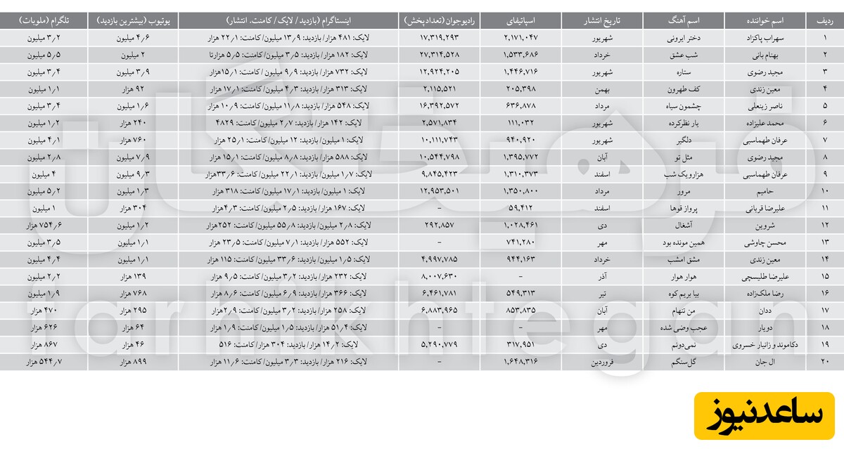 همانطور که تا به اینجای گزارش گفته شد، در سال 1403، بسیاری از آهنگهایی که بیشتر شنیده شدند، محتوا را فدای فرم کرده بودند. این روند، نشانهای است از تغییر ذائقه مخاطب بهسوی موسیقیهایی با ریتمهای ساده، ملودیهای تکرارشونده و تنظیمهایی با ریتمهای نسبتاً تند؛ آثاری که بیش از آنکه برای تأمل ساخته شده باشند، مناسب شنیدنهای گذرا و مصرف سریع در شبکههای اجتماعی هستند. جدولی که در این گزارش آمده، بر پایه رصد و بررسی میدانی روندهای موسیقی در سال گذشته تنظیم شده است. این جدول شامل فهرستی از آهنگهایی است که در بازههای زمانی مختلف، بیشترین تکرار و بازپخش را در پلتفرمهایی مانند اینستاگرام، یوتیوب، کانالهای تلگرامی و برنامههای مختص به موسیقی داشتند. معیار اصلی در تنظیم این جدول، میزان حضور آهنگها در فضای عمومی، فراگیری در میان کاربران و میزان استفاده از آنها در ویدئوهای وایرال بوده است؛ نه لزوماً کیفیت هنری یا دادههای رسمی. این جدول کمک میکند تا درکی دقیقتر از نوع موسیقیهایی که ذهن شنوندگان ایرانی را در سال 1403 اشغال کردهاند به دست آوریم؛ موسیقیهایی که گاه تنها با یک بیت ساده یا ریتمی خاص، تبدیل به صدای پسزمینه زندگی روزمره شدهاند و به همان سرعتی که آمدند، از ذهنها فراموش شدند.